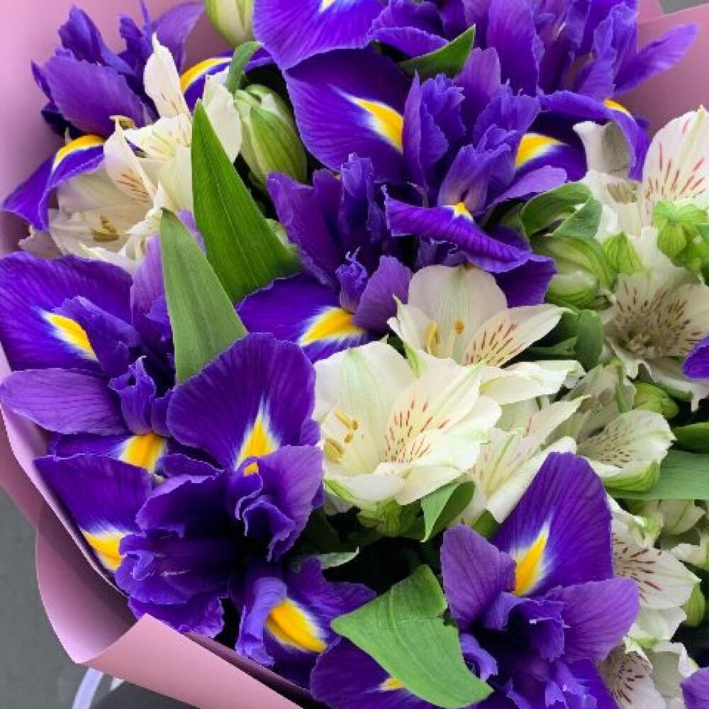 Альстромерия – 8 шт.Ирис – 11 шт.Лента атласная – 1 шт.Упаковка дизайнерская – 1 шт.
