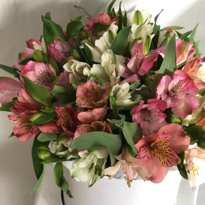 Альстромерия – 11 шт.Упаковка дизайнерская – 2 шт.Коробка шляпная – 1 шт.Пиафлор (оазис) – 1 шт.