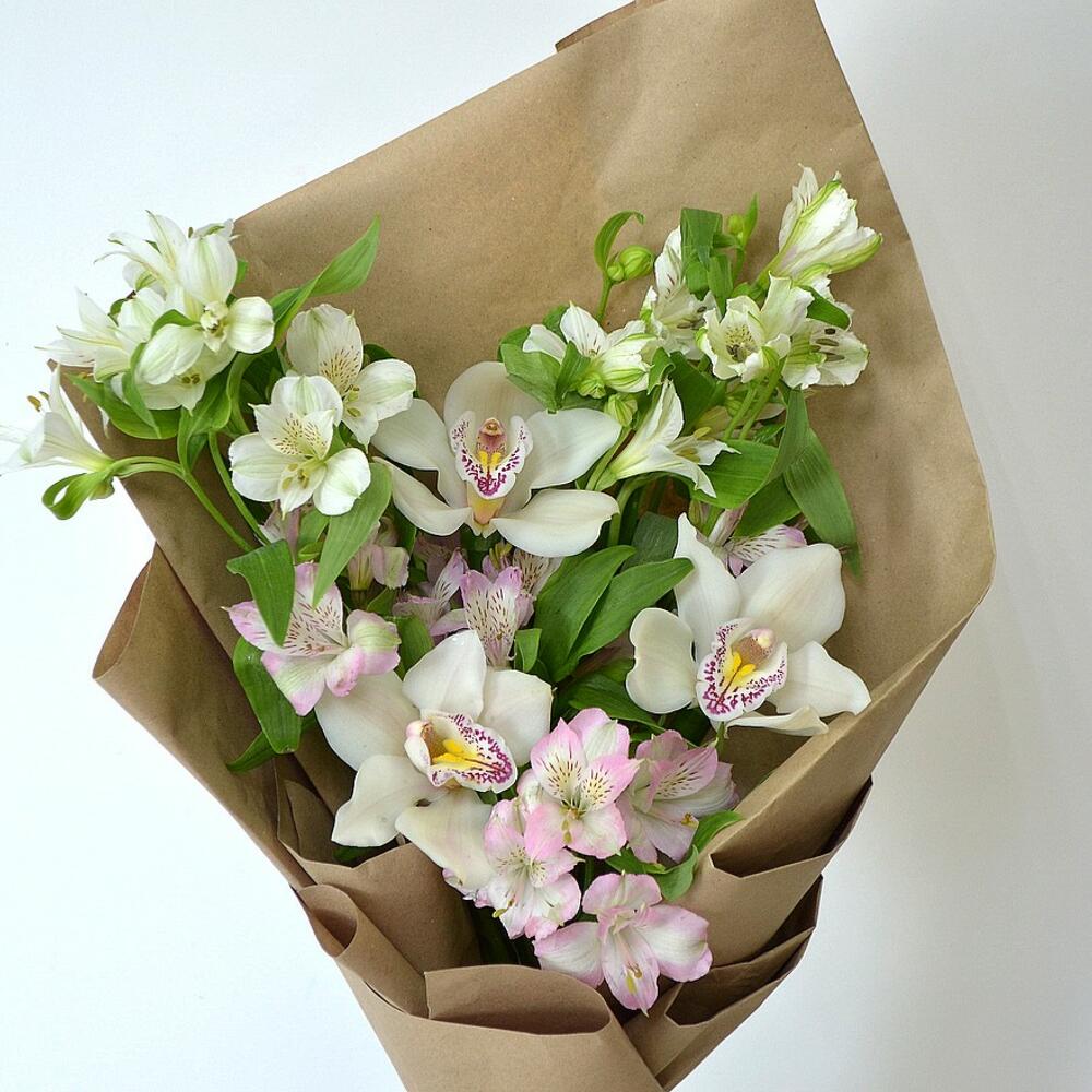 Красивый букет с альстромериями и орхидеями в крафте
