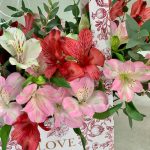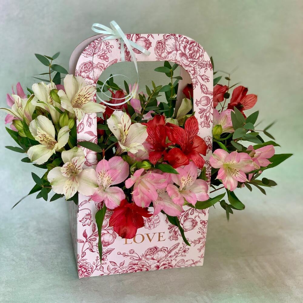 Красная коробка с альстромериями и зеленью