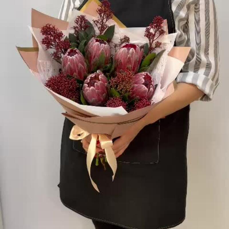 Прекрасный, экзотический и очень стойкий букет из протеи и скимии! Отлично подойдёт для коллеги, и близкого человека. Букет хорошо смотрится в качестве основного подарка, и может быть как дополнение к основному подарку.