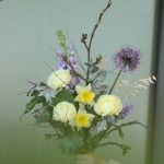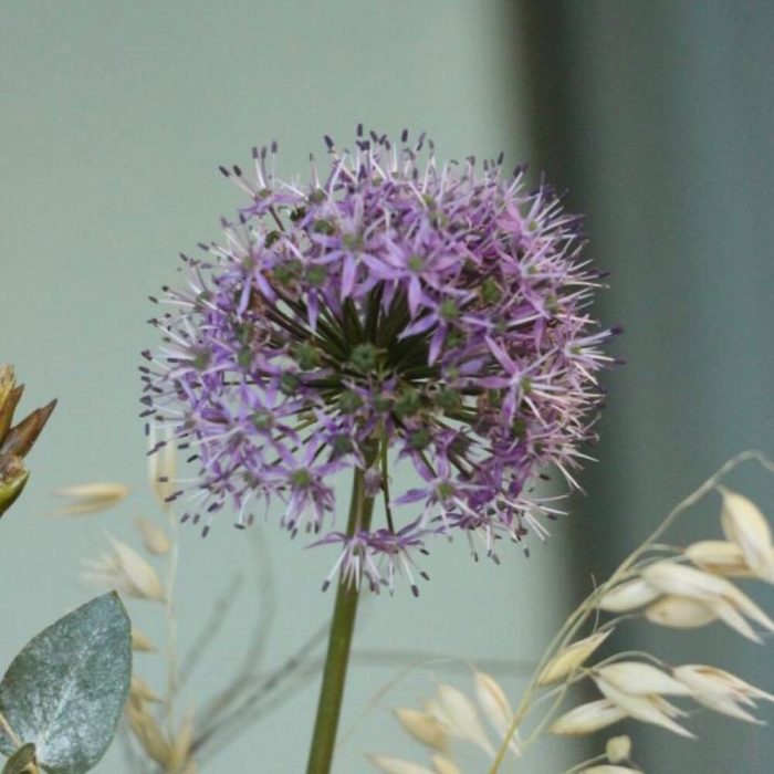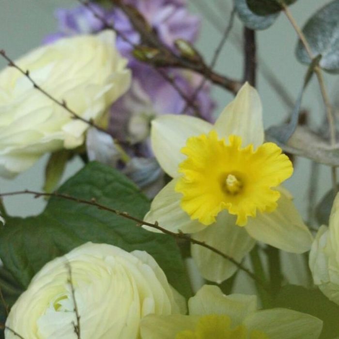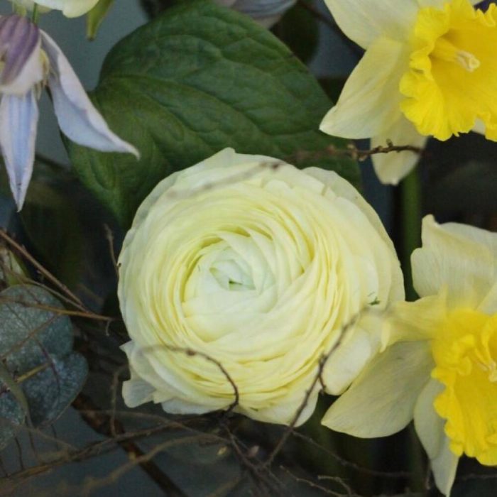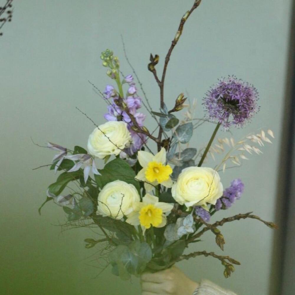 Ранункулюс – 3 шт.Нарцисс – 2 шт.лук полевой – 1 шт.Клематис – 1 шт.Маттиола – 1 шт.Овес – 5 шт.Ветка – 3 шт.Эвкалипт – 4 шт.Лента – 1 шт.