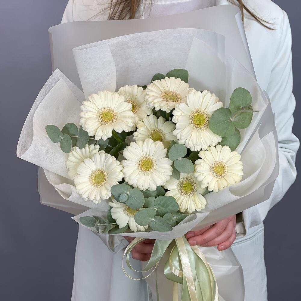 Лента – 1 шт.Эвкалипт – 2 шт.Упаковка – 1 шт.Гербера мини – 11 шт.