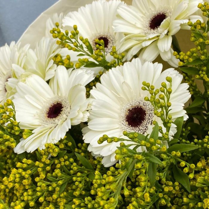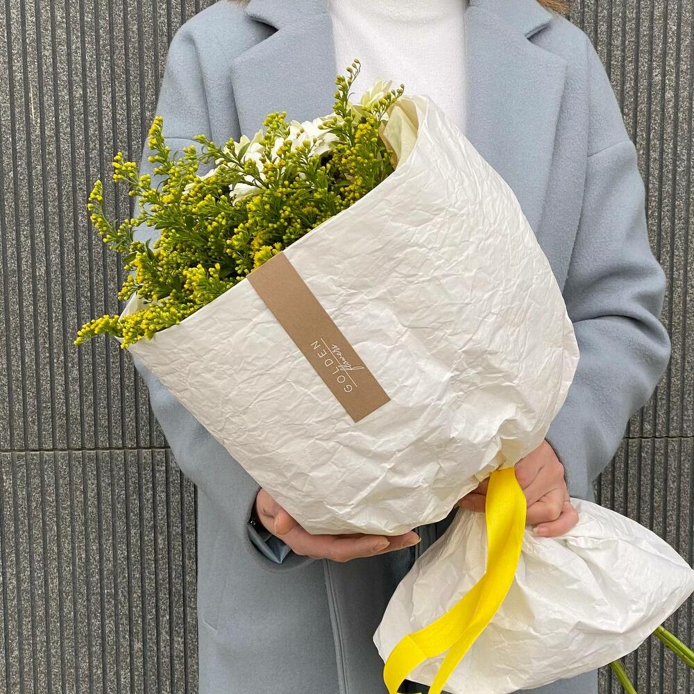 Солидаго – 4 шт.Тишью – 2 шт.Гербера – 7 шт.крафтовая бумага – 1 шт.фирменный транспортировочный пакет – 1 шт.
