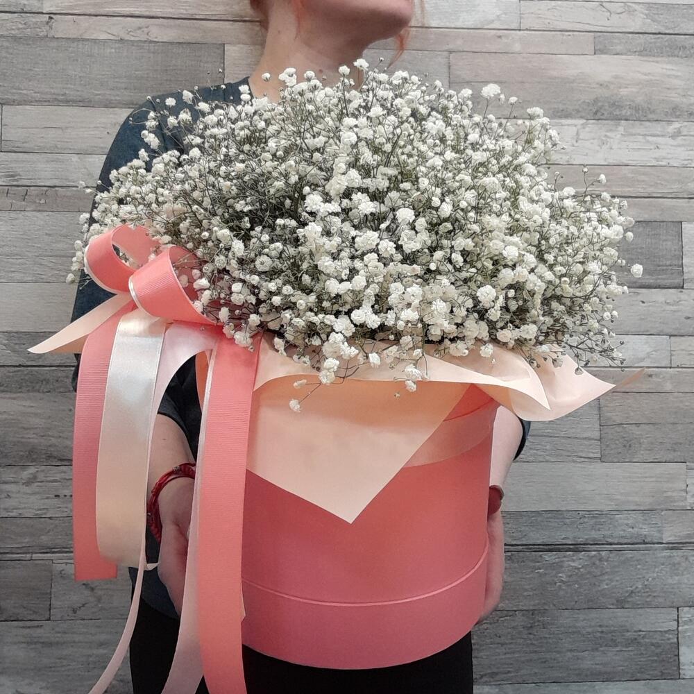 Гипсофила – 15 шт.Лента атласная – 4 шт.Шляпная коробка – 1 шт.Упаковка дизайнерская – 1 шт.Оазис флористический – 1 шт.