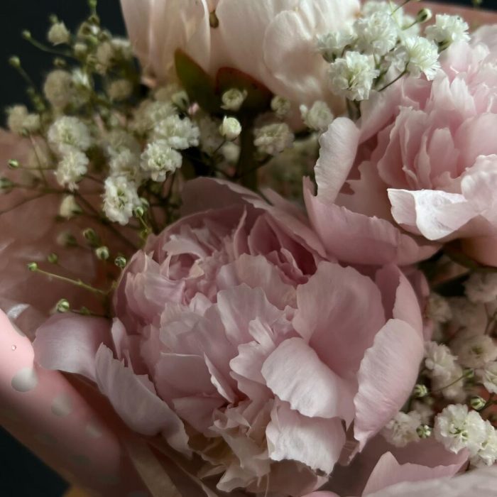 Гипсофила – 2 шт.Атласная лента – 1 шт.декоративная упаковка – 1 шт.пионы – 3 шт.