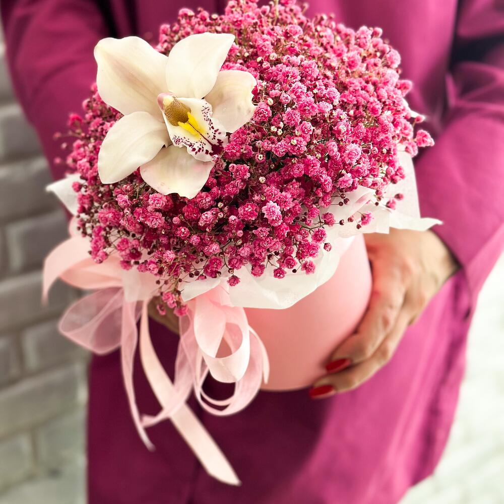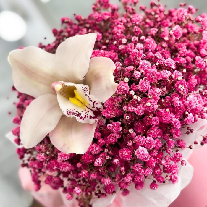 Гипсофила – 7 шт.Тишью – 1 шт.Орхидея цимбидиум мини – 1 шт.Открыточка с вашими пожеланиями – 1 шт.шляпная коробка с лентами и оазисом – 1 шт.
