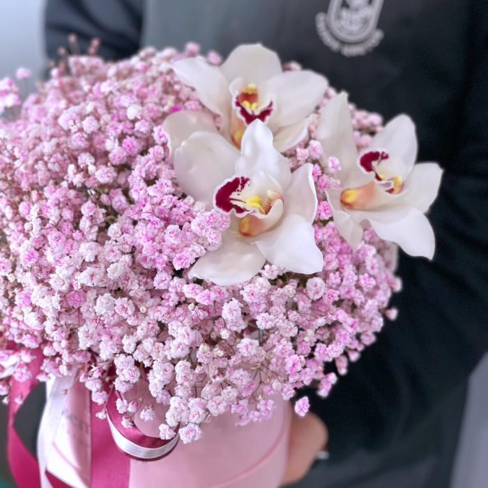 розовая гипсофила – 7 шт.Орхидея Цимбидиум – 3 шт.Шляпная коробка с лентами – 1 шт.