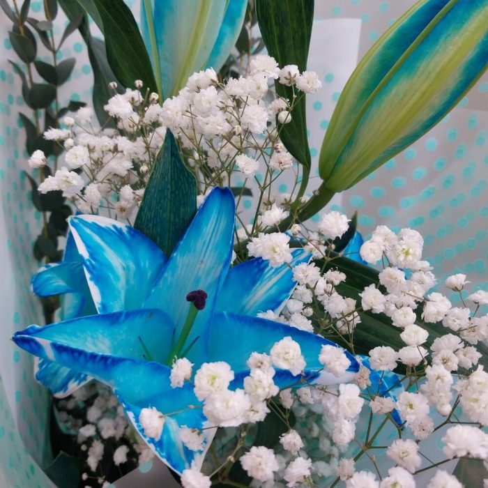 Гипсофила – 1 шт.Эвкалипт – 2 шт.Упаковка дизайнерская – 6 шт.лилия евро голубая – 1 шт.