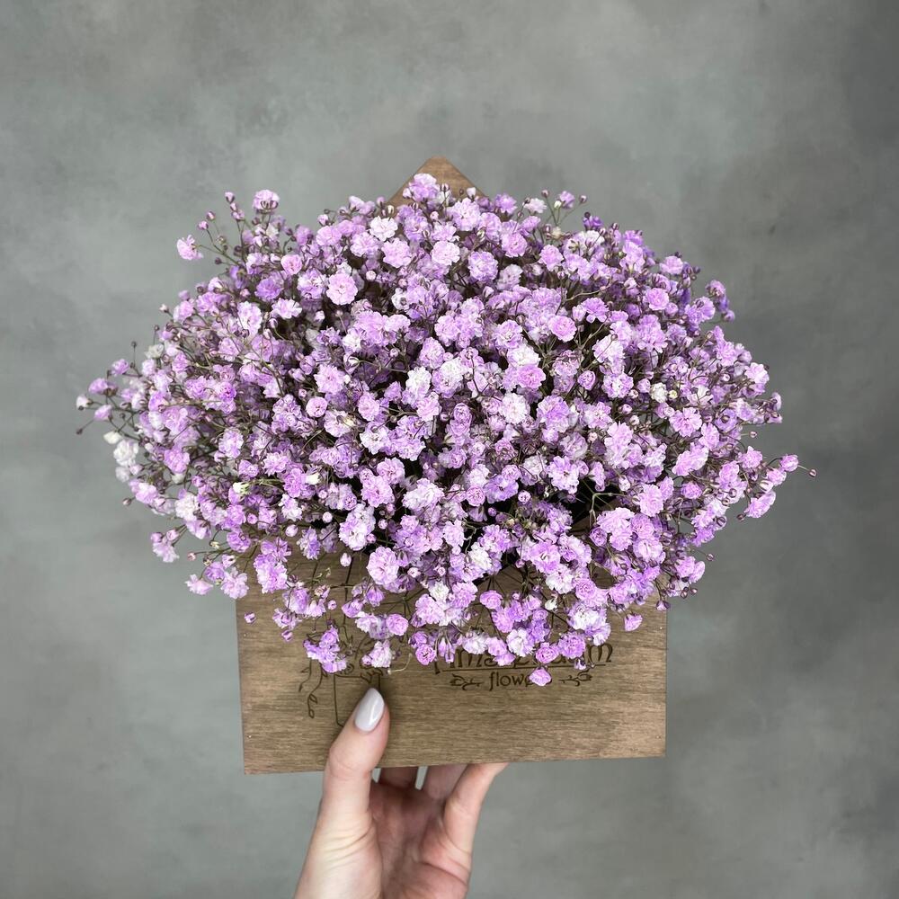 Гипсофила – 5 шт.Ящик деревянный – 1 шт.Оазис флористический – 1 шт.