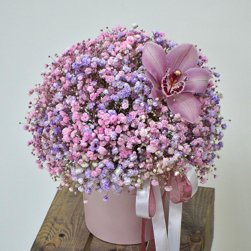 Нежный букет с гипсофилой и орхидеей в шляпной коробке