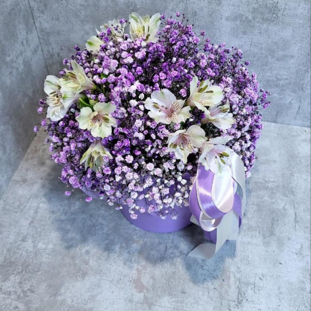Гипсофила – 5 шт.Альстромерия – 3 шт.Лента атласная – 2 шт.Шляпная коробка – 1 шт.Оазис флористический – 1 шт.