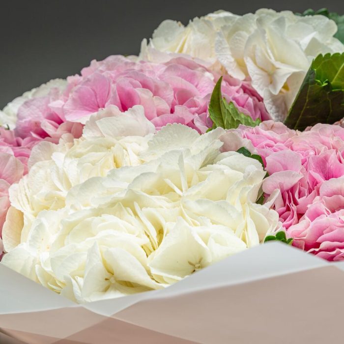 гортензия белая премиум – 5 шт.гортензия розовая премиум – 6 шт.Лента атласная – 3 шт.Коробка дизайнерская – 2 шт.хорошее настроение – 100 шт.