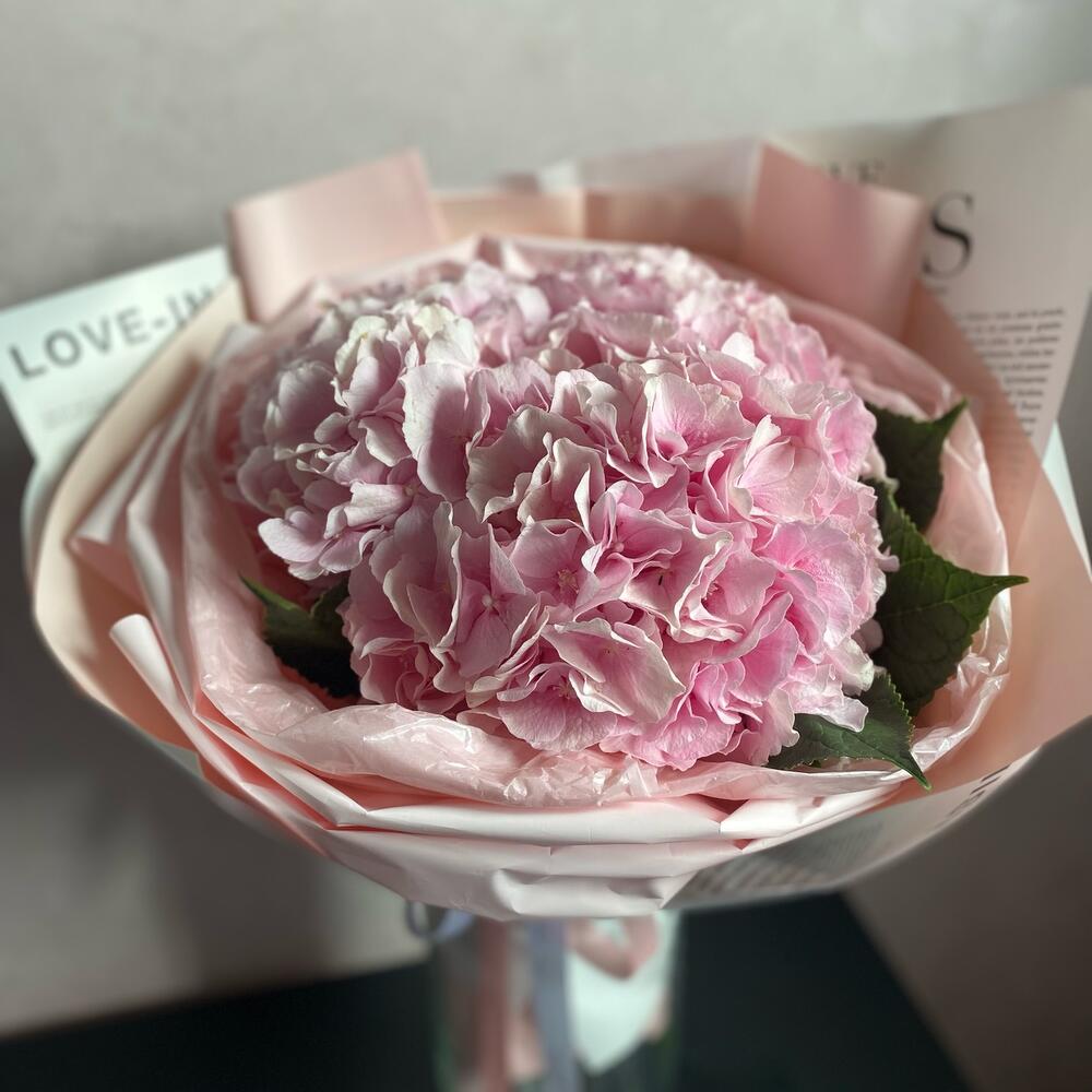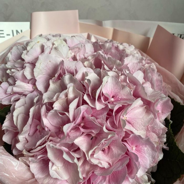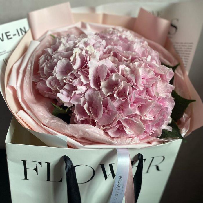 декоративная упаковка – 1 шт.Атласная лента – 1 шт.Гортензия розовая – 3 шт.