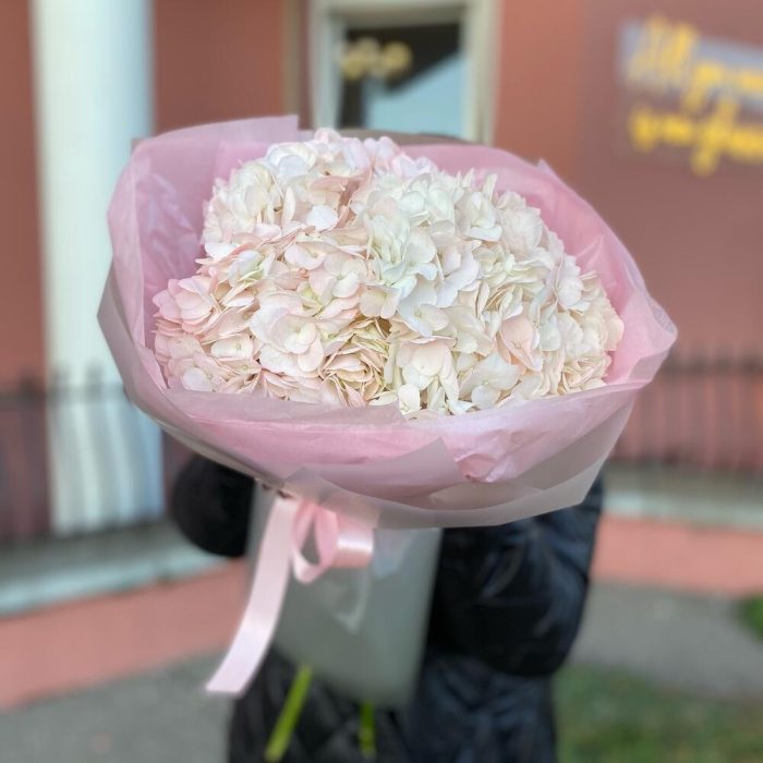 Гортензия – 3 шт. Атласная лента – 1 шт. Тишью – 1 шт. Пленка дизайнерская – 1 шт.