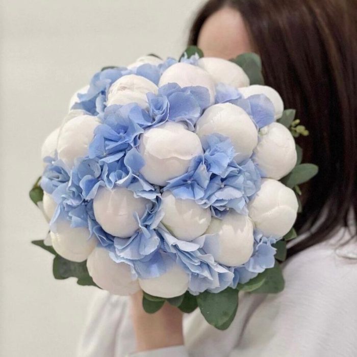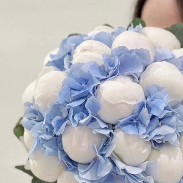 Букет из белых пионов и голубой гортензии
