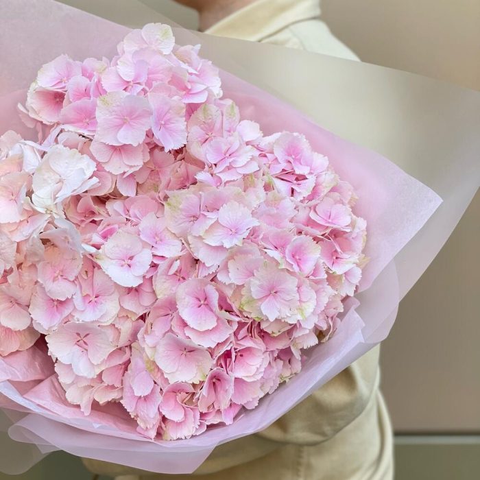 Лента атласная – 2 шт.Тишью – 2 шт.Упаковка дизайнерская – 4 шт.Гортензия розовая – 5 шт.