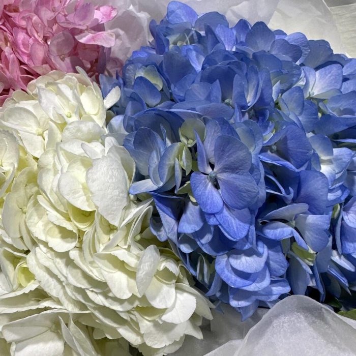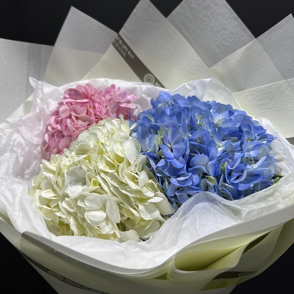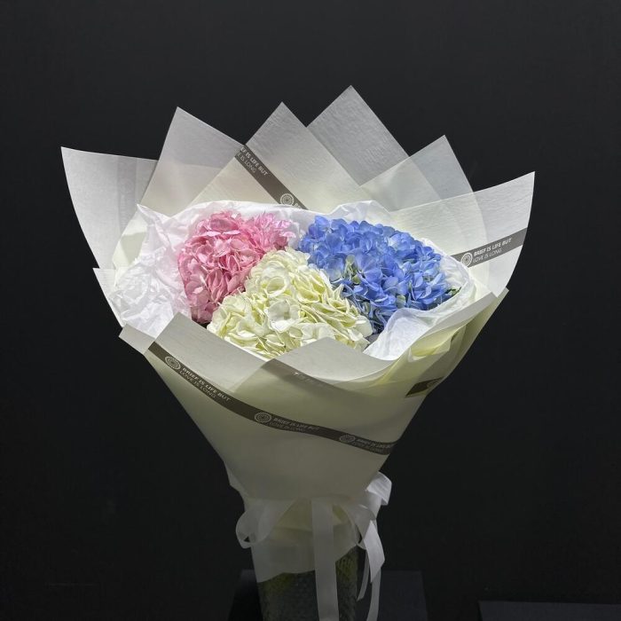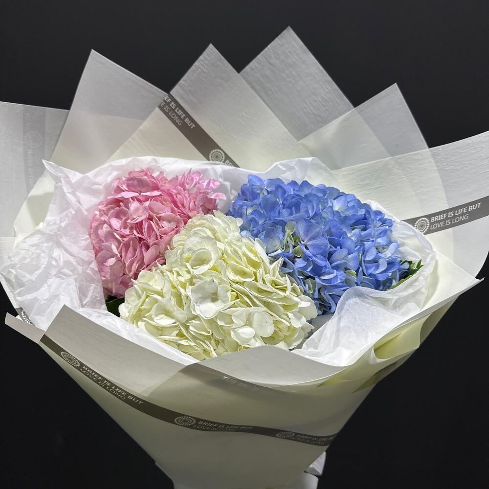 Букет 'Гармония гортензий' воплощает в себе нежность и изысканность с помощью пышных гортензий различных оттенков, создавая волшебную атмосферу спокойствия."