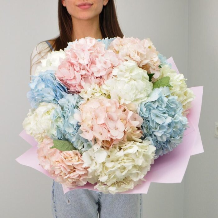 Гортензия – 15 шт.Лента атласная – 2 шт.Фоамиран (упаковка) – 2 шт.подкормка для срезанных цветов – 1 шт.инструкция по уходу за цветами – 1 шт.