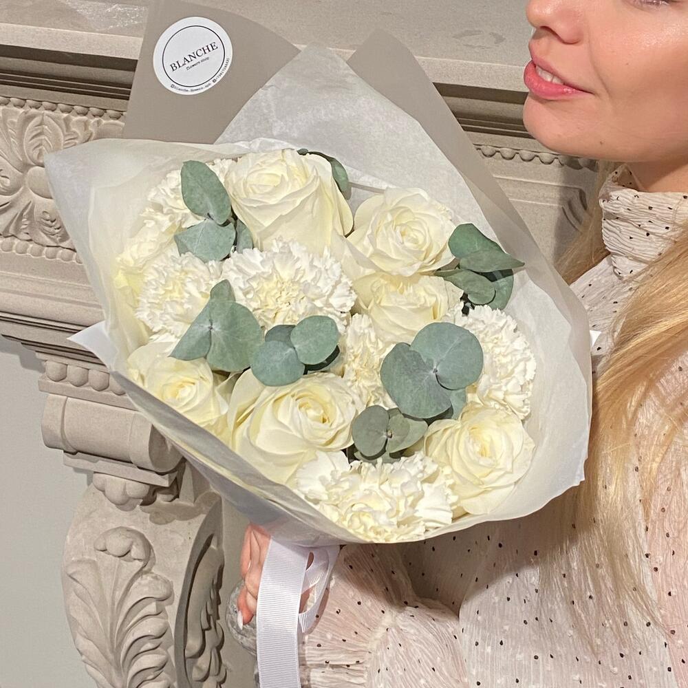 белые розы – 7 шт.Диантус белый – 6 шт.Фирменная упаковка – 1 шт.Эвкалипт – 5 шт.