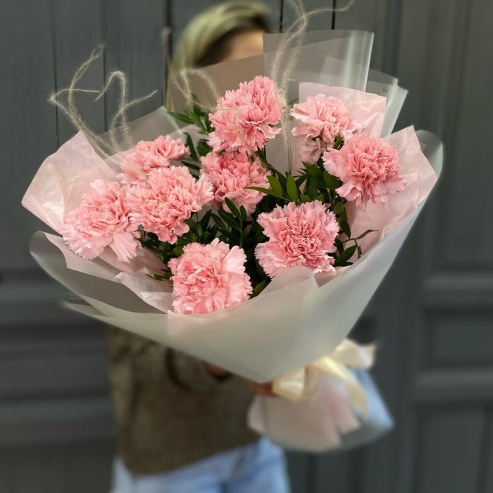 Диантус сортовой – 9 шт.Фисташка – 1 шт.Ковыль – 2 шт.Упаковка дизайнерская – 2 шт.Лента атласная – 1 шт.