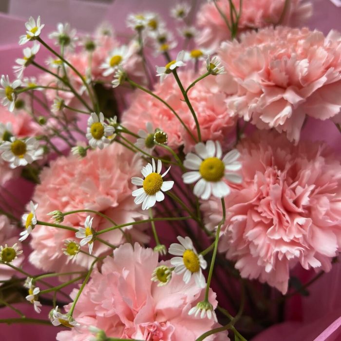 Лента атласная – 1 шт.Тишью – 3 шт.Диантус – 9 шт.Матрикария – 2 шт.Пленка матовая – 1 шт.