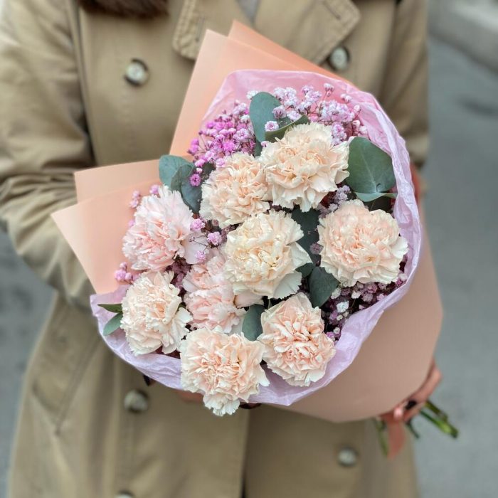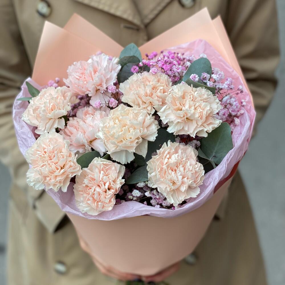 Диантус – 9 шт.Гипсофила – 2 шт.Эвкалипт – 2 шт.Упаковка дизайнерская – 1 шт.