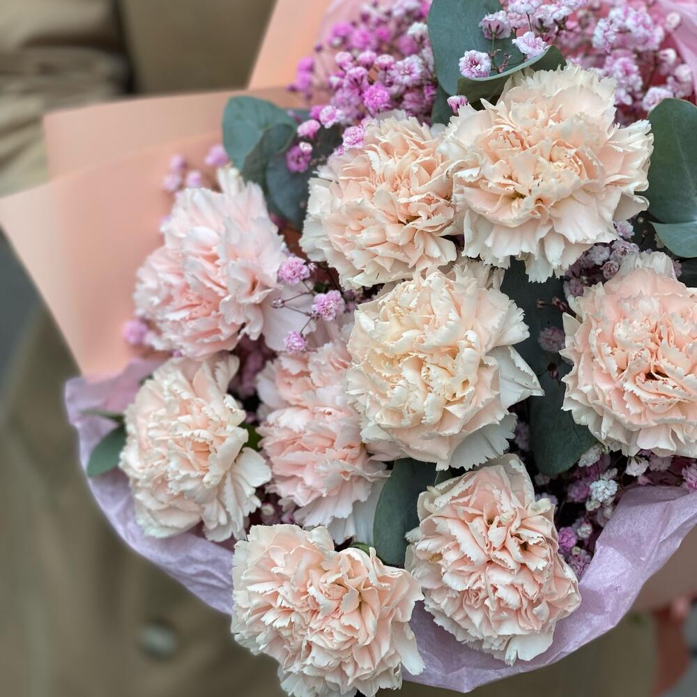 Букет из диантусов с гипсофилой и эвкалиптом