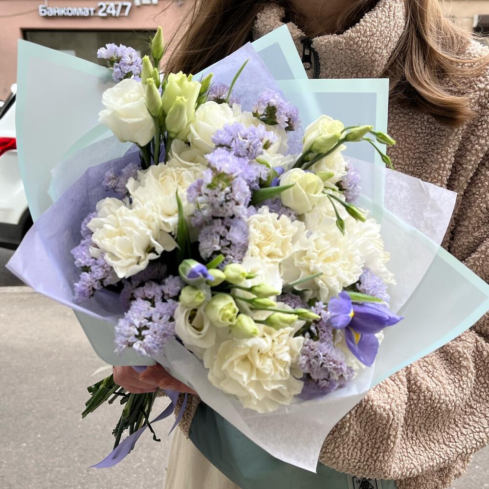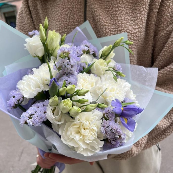 Диантус белый – 8 шт.Ирис синий – 3 шт.лизиантус эустома белый – 2 шт.Статица фиолетовая – 2 шт.Упаковка дизайнерская – 2 шт.