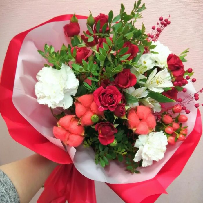 Альстромерия – 1 шт.Гиперикум – 1 шт.Роза кустовая – 3 шт.Упаковка – 1 шт.Диантус – 3 шт.Фисташка – 3 шт.Хлопок натуральный – 3 шт.лен сухоцвет – 3 шт.
