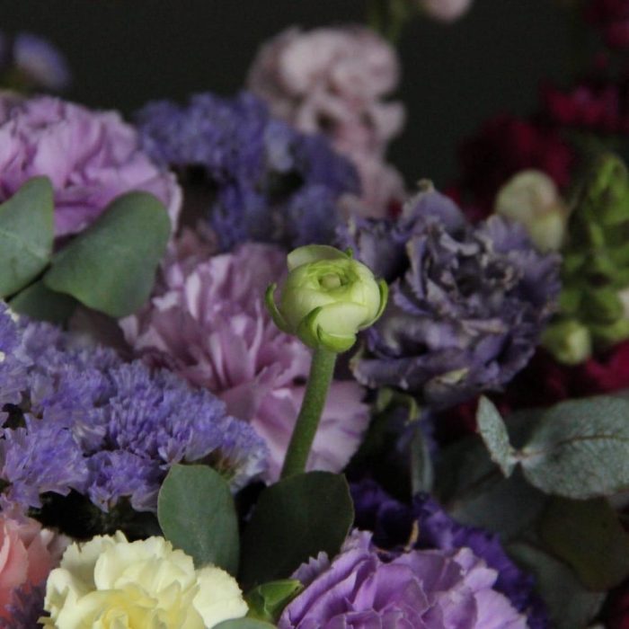 Шляпная коробка с сиренью, статицей, маттиолой, гвоздиками, ранункулюсами, лизиантусом и лагурусом эвкалиптом.Стильное цветочное решение для любого случая.