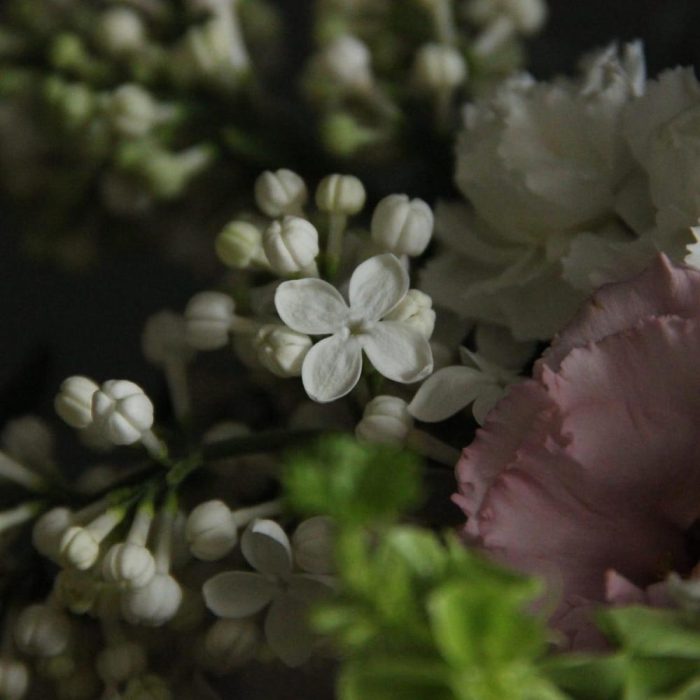 Сирень – 5 шт.Статица – 3 шт.Маттиола – 6 шт.Пион – 2 шт.Гвоздика сортовая – 15 шт.Лизиантус – 4 шт.Лагурус – 10 шт.Эвкалипт Микс – 5 шт.Олива – 5 шт.Оазис флористический – 1 шт.Коробка шляпная – 1 шт.Лента атласная – 2 шт.