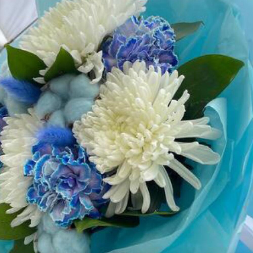 Голубой букет с хризантемами в дизайнерском оформлении