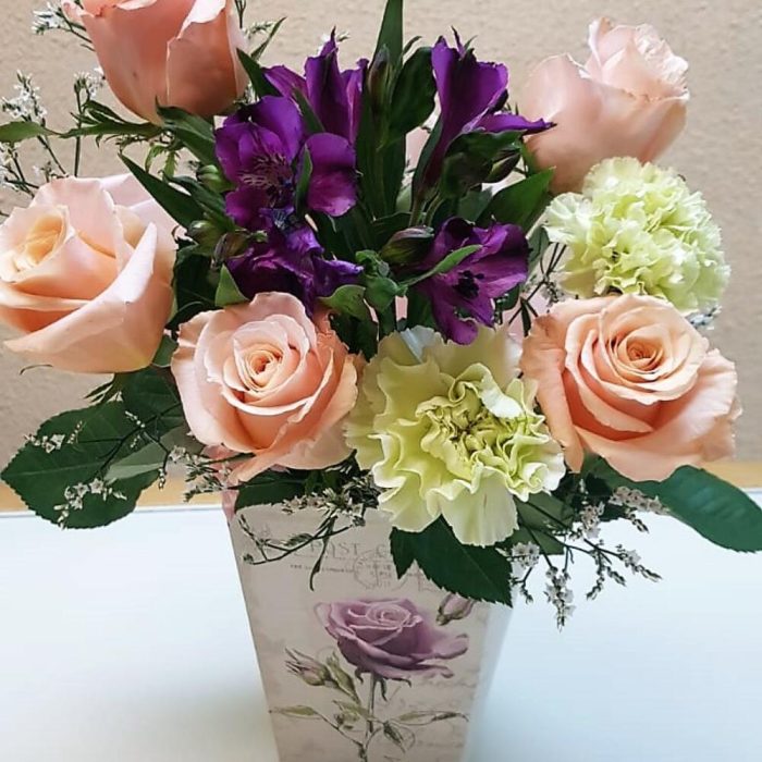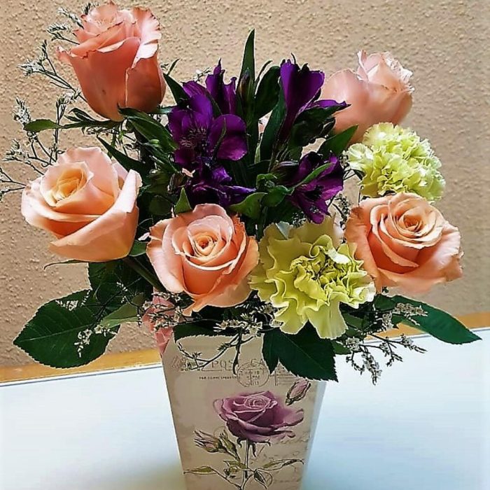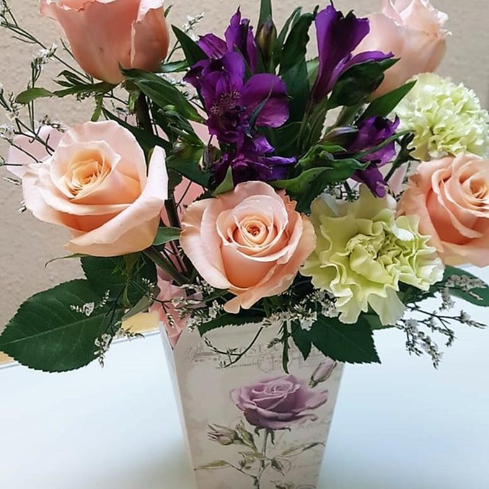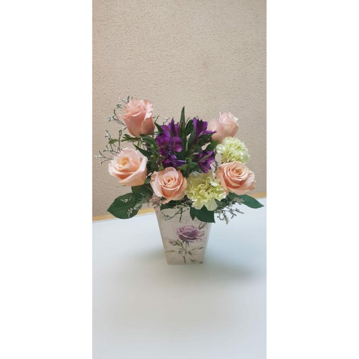 Роза Эквадор – 5 шт.Альстромерия – 1 шт.Лимониум – 1 шт.Гвоздика – 2 шт.Коробка – 1 шт.Бумага – 1 шт.