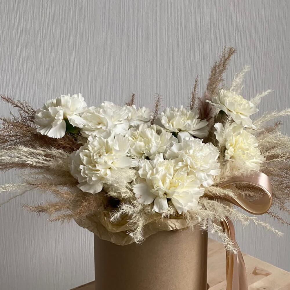Композиция в шляпной коробке из гвоздик с сухоцветами