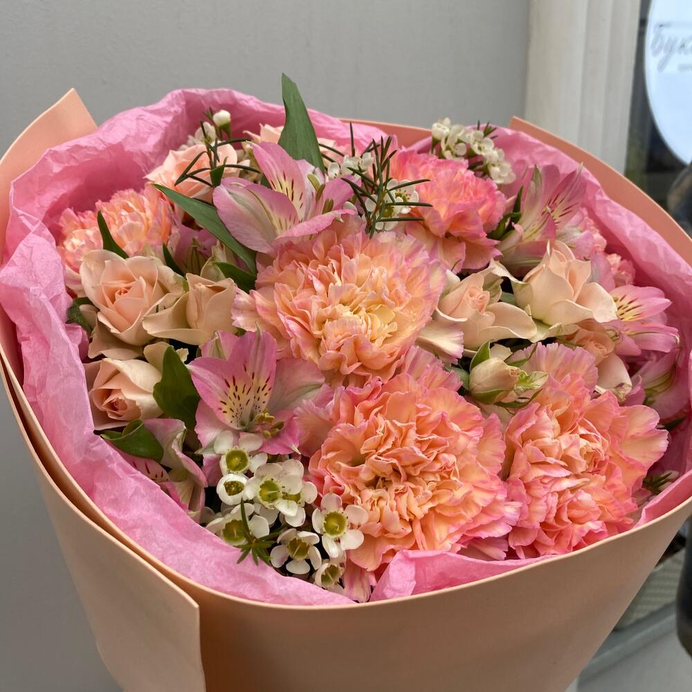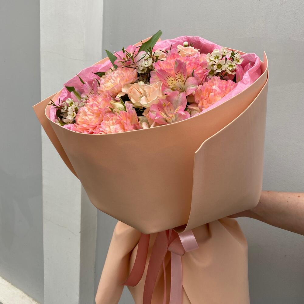 Диантус – 6 шт.Хамелациум – 1 шт.Роза кустовая – 3 шт.Рускус сочи – 5 шт.Альстромерия – 3 шт.Тишью – 2 шт.Фоамиран (упаковка) – 2 шт.Лента атласная – 2 шт.