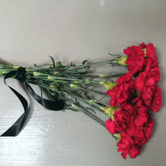 Красная гвоздика 10шт с траурной лентой