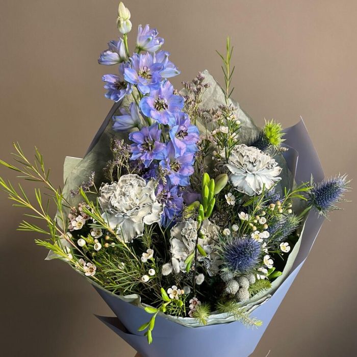 Верба – 2 шт.Лента – 2 шт.Лимониум – 2 шт.Фрезия фиолетовая – 2 шт.Пленка матовая – 2 шт.Эрингиум синий – 1 шт.Дельфиниум голубой – 1 шт.Ваксфлауэр хамелациум – 3 шт.тишью дизайнерская – 3 шт.гвоздика диантус серый – 3 шт.берцеллия бруния – 1 шт.