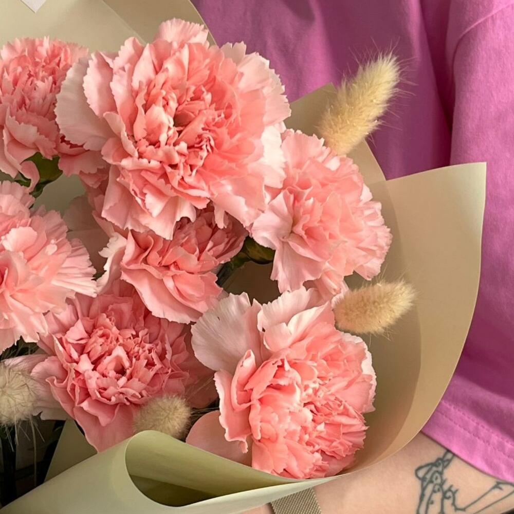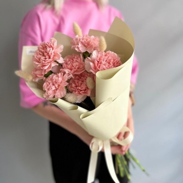 Розовые диантусы (гвоздики) с лагурусом