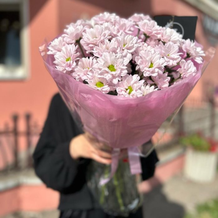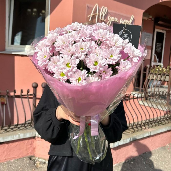 Тишью – 1 шт. Атласная лента – 1 шт. Целлофан – 1 шт. Ромашковая хризантема – 5 шт.