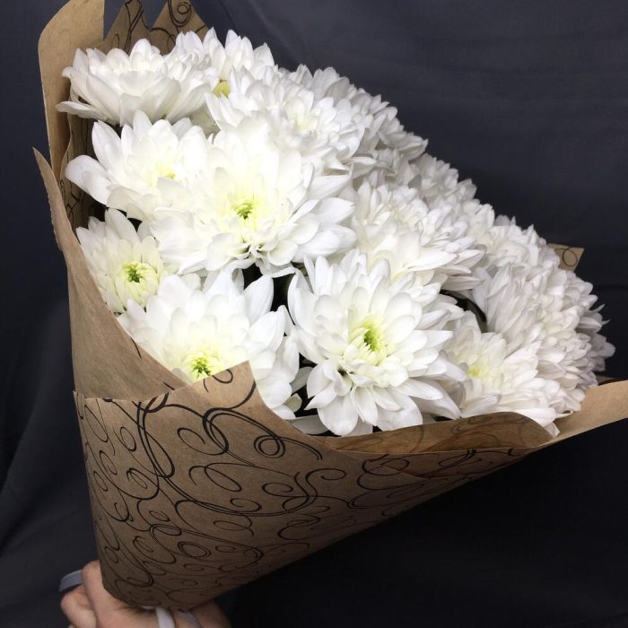 Лента атласная – 1 шт.Хризантема кустовая белая – 7 шт.Упаковка дизайнерская – 1 шт.