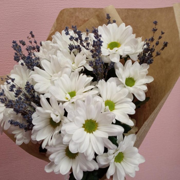 Лаванда (сухоцвет) – 10 шт.Лента – 1 шт.Упаковка – 1 шт.хризантема (ромашка) кустовая – 5 шт.