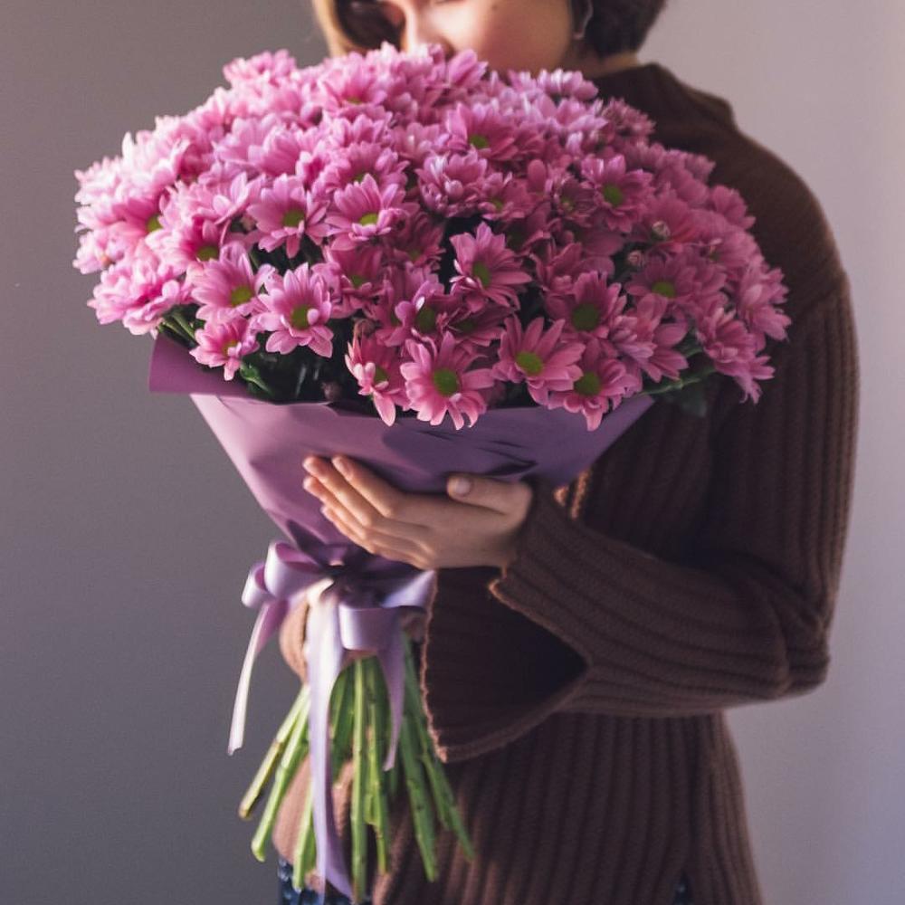 Хризантема кустовая – 15 шт.Упаковка дизайнерская – 1 шт.Лента атласная – 1 шт.