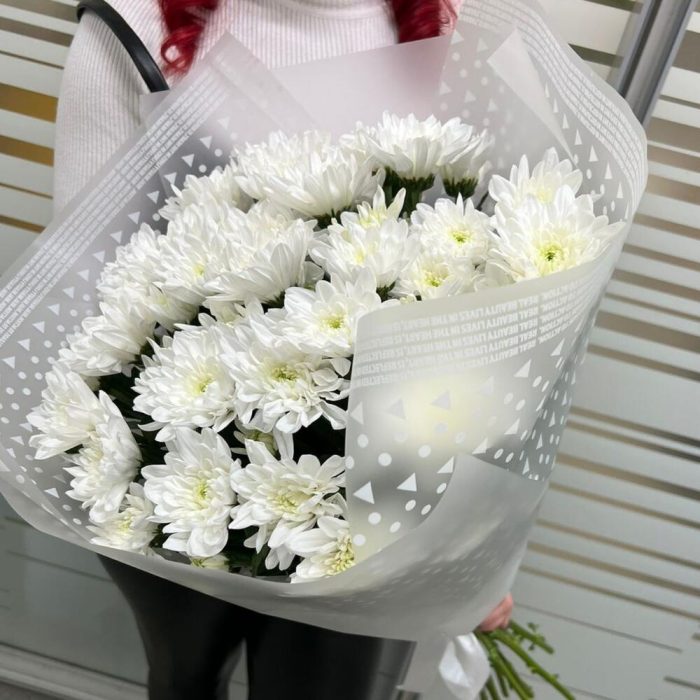 Упаковка – 2 шт.Лента атласная – 1 шт.Хризантема кустовая белая – 9 шт.