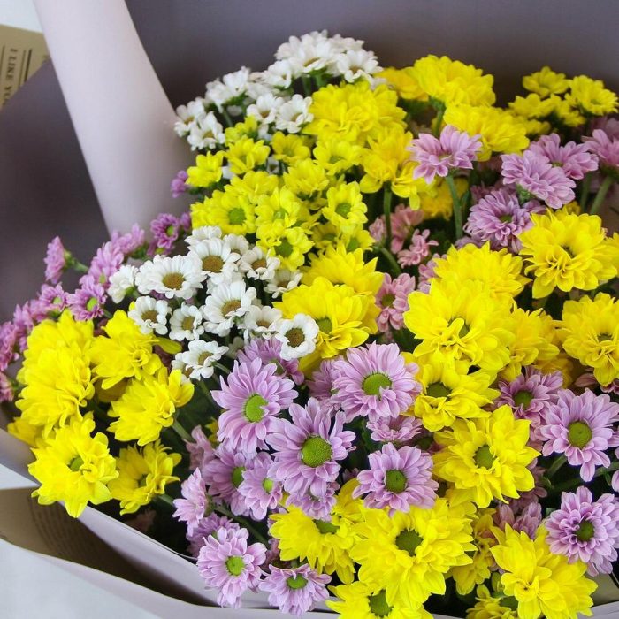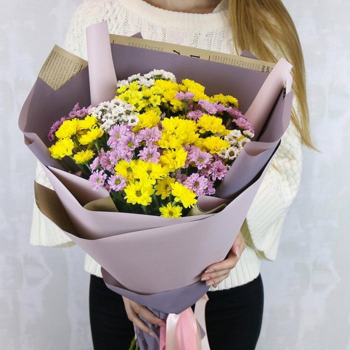 Букет из 15 кустовых хризантем Сантини микс в стильной упаковке