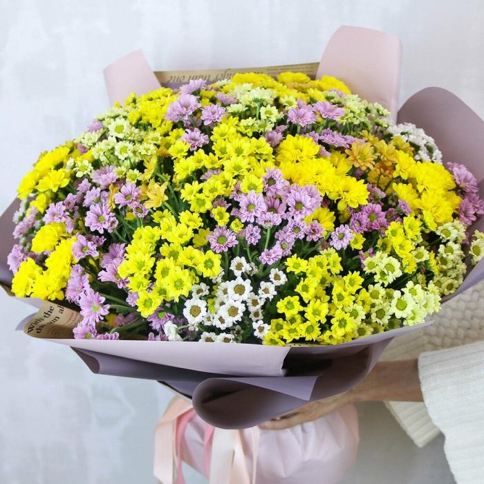 Букет из 49 кустовых хризантем Сантини микс в стильной упаковке