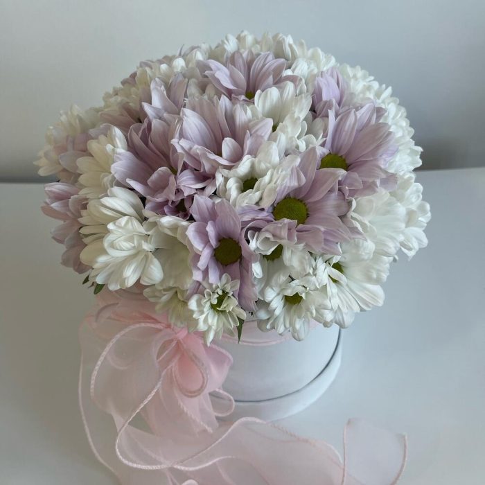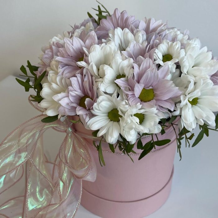 Нежная очаровательная композиция из хризантем в шляпной коробке – отличный комплимент для близкого человека. Свежие ароматные цветы станут приятным сюрпризом и подарят прекрасное настроение.Уважаемые покупатели! Пожалуйста обратите ваше внимание на размер композиции при заказе! Он учитывается вместе с упаковкой Чтобы наши прекрасные композиции дольше радовали получателя рекомендуем вам:⭐Не вынимать цветы из коробки/корзинки⭐Поливать композицию каждый день (воду нужно вливать в центр, чтобы вода правильно распределилась) ⭐Не ставить цветы у отопительных приборов и на сквозняке