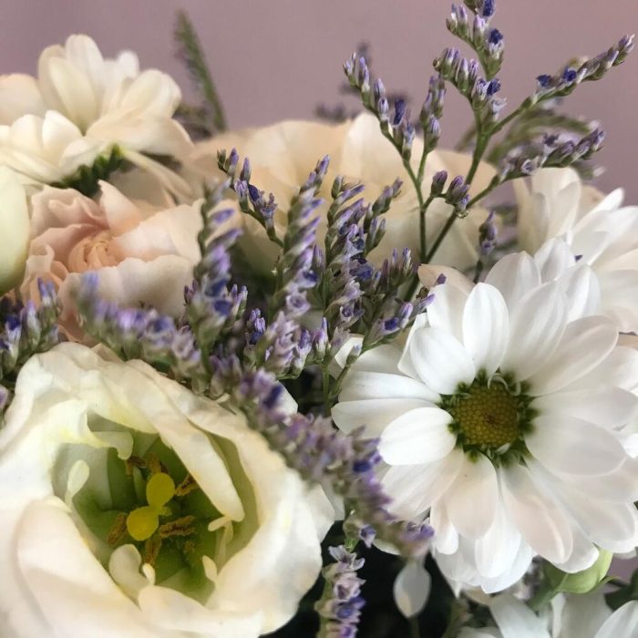 Лизиантус – 2 шт.Лимониум – 3 шт.Хризантема кустовая – 3 шт.Кашпо – 1 шт.Бабочка декоративная – 1 шт.