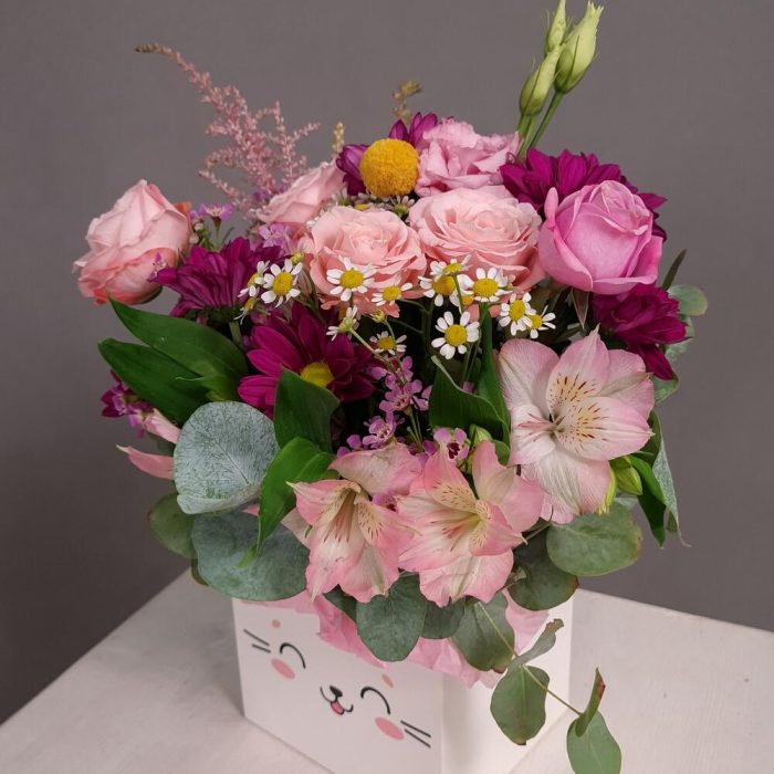 Альстромерия – 1 шт.Астильба – 3 шт.Ваксфлауэр – 1 шт.Краспедия – 1 шт.Хризантема кустовая – 1 шт.Эвкалипт – 2 шт.Эустома – 1 шт.Ромашка кустовая – 1 шт.Коробка – 1 шт.губка флористическая с водой – 1 шт.