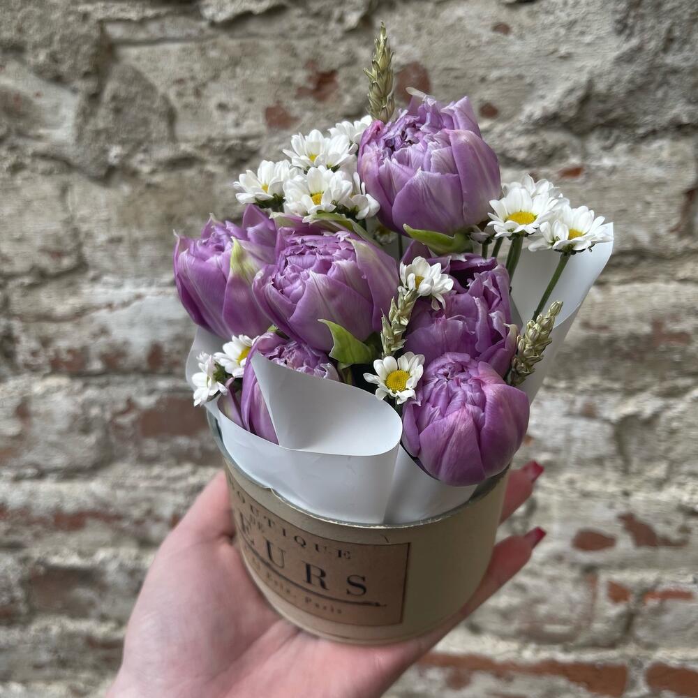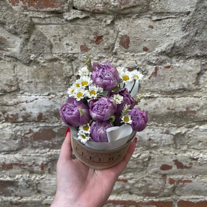 Хризантема Сантини – 1 шт.Тюльпан пионовидный – 6 шт.Упаковка дизайнерская – 1 шт.